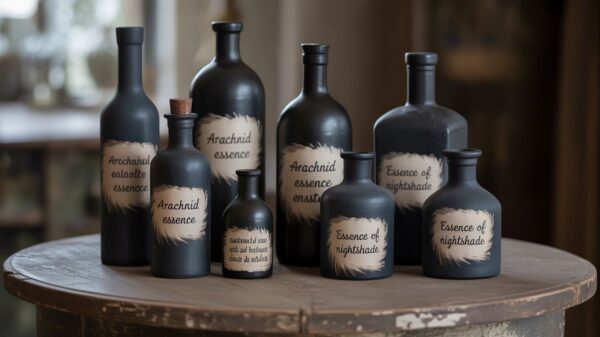 With this elegant-meets-eerie centerpiece idea that looks like it cost a fortune but uses mostly dollar store finds. Save glass bottles with a variety of shapes and sizes. Wine bottles, olive oil bottles, bud vases, even bottle water bottles. Paint them all with matte black paint. Add feathered labels using paper stained with tea. Add spooky fonts that say “magic potion”. The key is layering different heights and bottle shapes to create visual interest – think of it as a spooky still life that Pottery Barn would totally feature (if they had a Halloween line). Add handwritten labels with Latin-sounding names like “Arachnid Essence” or “Essence of Nightshade” for that authentic vintage laboratory vibe that’s been trending all over Instagram lately.