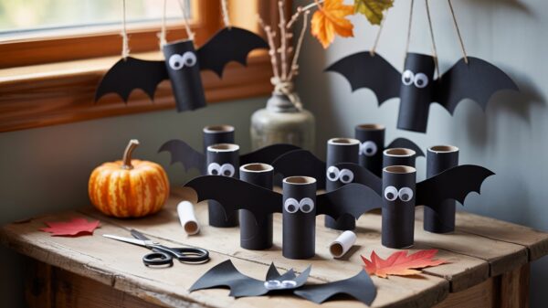 This is one of those hacks that looks way harder than it is. Cut toilet paper rolls in half lengthwise, then fold them to create bat wing shapes – the natural curve of the cardboard does most of the work for you. Paint them matte black (dollar store acrylic paint works perfectly), add tiny googly eyes, and attach them to your wall in a swooping pattern that flows up your staircase or across your living room. The 3D effect creates amazing shadows that make your wall look like it’s literally alive with bats.