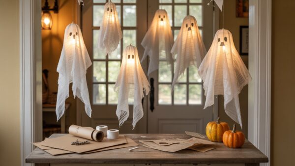 These dramatic ceiling installations bring serious haunted mansion vibes to any room and move beautifully with air circulation from heating vents or fans. Drape cheesecloth over wire forms (or even just crumpled newspaper for budget-friendly structure), securing at the “neck” with invisible thread. The loose weave of cheesecloth creates amazing texture and allows air to flow through, making them dance and sway naturally. Hang them at varying heights in corners, doorways, or over dining tables for maximum impact – home decor influencer Shea McGee would definitely appreciate how they add vertical interest to a space! The translucent fabric catches light beautifully during the day and creates mysterious shadows at night.