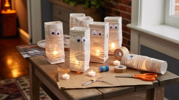 Transform your walkway into an ancient Egyptian tomb entrance with these charming mummy luminaries that combine function with serious Halloween style. Wrap paper lunch bags with strips of newspaper or medical gauze, leaving gaps for light to peek through, then add googly eyes positioned at different angles for individual personality. Place battery-operated tea lights inside and line them along your sidewalk or porch steps for a warm, welcoming glow that’s still appropriately spooky. The newspaper gives them a vintage, archaeological feel (especially if you use pages with interesting headlines!), and the soft flickering light creates the most magical ambiance for trick-or-treaters approaching your door.