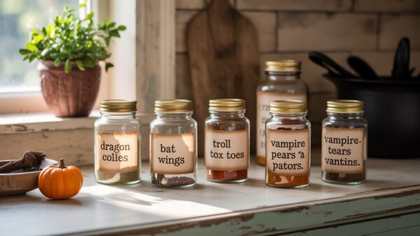 Transform your ordinary spice rack into a witch’s pantry with custom labels that turn everyday ingredients into magical potions – it’s functional Halloween decorating at its finest! Create aged-looking labels using tea or coffee stains on regular paper, then rename your spices with spooky alternatives like “Bat Wings” for black pepper, “Troll Toes” for whole cloves, or “Vampire Tears” for vanilla extract. The beauty of this project is that it works with spices you already own, costs almost nothing to execute, and creates amazing conversation starters for guests. Food Network personalities would totally approve of this kind of seasonal kitchen styling that’s both practical and festive. Plus, it makes cooking dinner feel like you’re brewing magical potions!