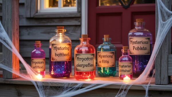 Transform ordinary jars into enchanting witch’s brew with this fun project. Fill jars with colored water (food coloring works great), add glitter for a magical shimmer, and create weathered labels using tea-stained paper and spooky fonts. Drop in battery-operated LED tea lights or glow sticks to make them eerily illuminate from within – the glow effect. Group them on your mantel, kitchen counter, or front porch steps with fake cobwebs draped around for maximum witchy vibes. Pro tip: add a few drops of dish soap and shake gently right before guests arrive for mysterious bubbling action that’ll have everyone asking for your secret.