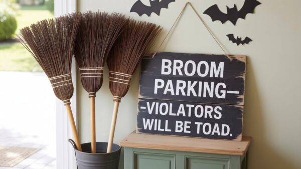 Cut a simple sign from cardboard or scrap wood and hand-letter “Broom Parking—Violators Will Be Toad.” Dry-brush black and white acrylic paint to look weathered. Stand a few dollar-store brooms (or DIY with sticks and twine) in a tall umbrella stand, bucket, or basket by the door. Add a few paper bats on the wall behind to frame the scene. It’s a charming welcome moment that sets the tone before guests even step inside.