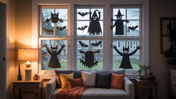 Create the illusion that your house is full of mysterious activity with these simple but incredibly effective window displays. Cut spooky shapes from black paper or cardboard – think witches, cats, bats, or even crime scene body outlines – and tape them to your windows from the inside. When lights are on inside, the silhouettes become dramatically visible from the street, making it look like your home is hosting the most interesting Halloween party ever. This is such a classic trick that even Martha Stewart has featured variations of it, but it never gets old because the impact is so immediate and striking. Position them in bedrooms, living rooms, and even bathrooms for maximum storytelling effect!