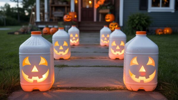 Create a warm, welcoming (yet festive) entrance using clean milk jugs transformed into oversized jack-o’-lanterns that glow beautifully after dark. Cut classic pumpkin faces into the jugs using a craft knife, paint them orange with acrylic paint, and add battery-operated string lights inside for a soft, ambient glow. Line them along your driveway or walkway, weighing them down with sand or small rocks so they don’t blow away. The translucent plastic diffuses the light perfectly, creating a magical lantern effect that’s much more durable than real pumpkins and can be stored and reused year after year. Home improvement shows like “Fixer Upper” always emphasize the importance of welcoming exterior lighting, and this definitely delivers on that front with seasonal flair!