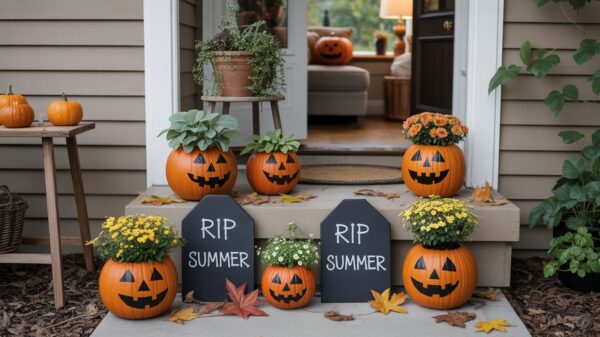 Turn ordinary craft pumpkins into a charming container garden that celebrates both Halloween and fall gardening trends. Hollow out foam or real pumpkins and plant them with trailing plants like creeping jenny or small mums in autumnal colors. Create tombstone markers using foam board or cardboard, writing silly epitaphs like “Here Lies Summer 2025” or “RIP Summer.” Arrange them on your porch steps with some scattered autumn leaves. This trend has been huge on gardening TikTok, showing how Halloween decor can still celebrate the beauty of the season!