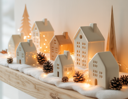 Wooden or ceramic house figurines that light up from within create that magical Nordic village look. Line them along a mantel, shelf, or windowsill — instant charm, minimal effort.