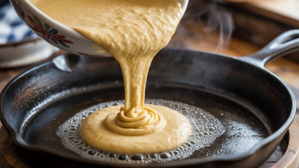 - Remove the skillet(s) carefully from the oven and add a small scoop of vegan butter. Swirl around and watch the butter sizzle. Transfer the batter to the skillet(s) and spread into an even layer. Delicately sprinkle on some red onion and bake for 20 minutes. Serve immediately.