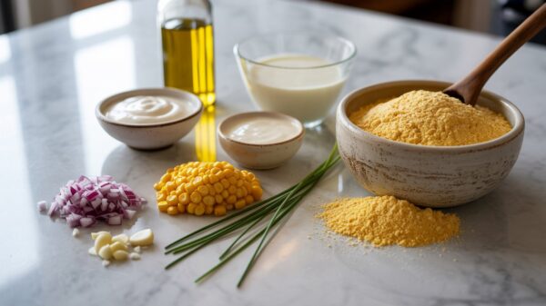 - Heat the olive oil in a medium skillet over medium-high heat and add the onion and garlic. Sauté for about 7 minutes, until soft and tender. Add the onion mixture, corn kernels, and chives to the cornmeal mixture. Mix well. Pour in the oil, yogurt, and milk. Stir until just combined.